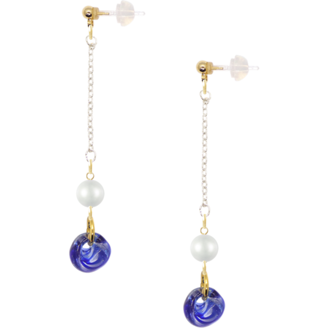 魅惑のデザイン、K I K I(ピアス/No64)が貴女の魅力を引き立てます。このピアスは、美しいブルーの手作りガラスとパールが融合した洗練されたデザインが特徴です。耳元で軽やかに揺れるチェーンが、日常のスタイルに特別なアクセントを加え、華やかな印象を演出します。